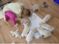 14.07.2014  +++  Ein neues Video   +++ Nicht nur die Welpen finden den Tunnel cool...  :-)  Hunde/Leni/A-Wurf/Welpen. 11.07.2014  +++  Ein neues Video   +++ 4,5 Wochen und schon Rückruf-Training mit der Pfeife   Hunde/Leni/A-Wurf/Welpen. 5.07.2014  +++  Zwei neue Videos   +++ Schöne Grüße nach Leipzig - es war ein schöner Nachmittag!! Hunde/Leni/A-Wurf/Welpen. 01.07.2014  +++  Hiermit löse ich mein Versprechen ein   +++ Schöne Grüße nach Erfurt. Das Video gibt es hier Hunde/Leni/A- Wurf/Welpen. 29.06.2014  +++  Welpen-Bar ist fertig   +++ Noch so klein aber sooo gierig - unglaublich. In den gedrehten Videos  kann das Verhalten schön beobachtet werden. Keiner schenkt dem Nachbarn etwas. Es wird gedrängelt, geschoben und jede Chance genutzt, um an die Zitze vom Nachbarn zu kommen. Vielleicht gibt es aber auch andere Geschmacksrichtungen - Erdbeere, Vanille und Schoko (Achselzucken & grins). Die Gewichtszunahmen sind bei den Welpen gigantisch. Um unsere Leni etwas zu unterstützen, geben wir seit zwei Tagen etwas Welpenmilch dazu. Alle vertragen die Milch sehr gut - keiner quält sich mit Durchfall, oder Bauchweh!!   Seit heute kann jeder Welpe die Milch mit der Zunge aufschlecken. Es  ist eine andere Technik - aber Übung macht den Meister.    Fotos vom “Schlabbern” findet ihr hier Hunde/Leni/A-Wurf/Welpen. Für unsere kleinen Fellzwerge habe ich heute eine mobile Welpen-Bar gebaut. Bin gespannt, ob wir damit später etwas mehr Ordnung, Gerechtigkeit und Kontrolle beim Fressen hinbekommen. 27.06.2014  +++  Kiste ist out - Freiheit ist in  +++ Video und Fotos findet ihr hier Hunde/Leni/A-Wurf/Welpen. 23.06.2014  +++  Jetzt wird es lebendig in der Kiste  +++ Das Video gibt es hier Hunde/Leni/A-Wurf/Welpen. 19.06.2014  +++  Die Kinderstube ist munter! +++ Das Video gibt es hier Hunde/Leni/A-Wurf/Welpen. 17.06.2014  +++  Alle haben jetzt die Augen auf +++ neue Fotos gibt es hier Hunde/Leni/A-Wurf/Welpen. Heute gab es die erste Wurmkur - schmeckte nicht so lecker... Wer noch Interesse an diesen tollen Wurf hat, sollte sich beeilen!!! 12.06.2014   +++  neue Fotos  +++ Die Fotos gibt es hier Hunde/Leni/A-Wurf/Welpen. 11.06.2014   +++  Auslauf für die Zwerge  +++ Heute bin ich mit den Vorbereitungen im Garten angefangen. Die ersten Zaunelemente stehen schon. Jetzt fehlt uns noch ein Bällchenbad, eine Wippe, ein Tunnel, und und und... Wir freuen uns schon auf den ersten Ausflug.